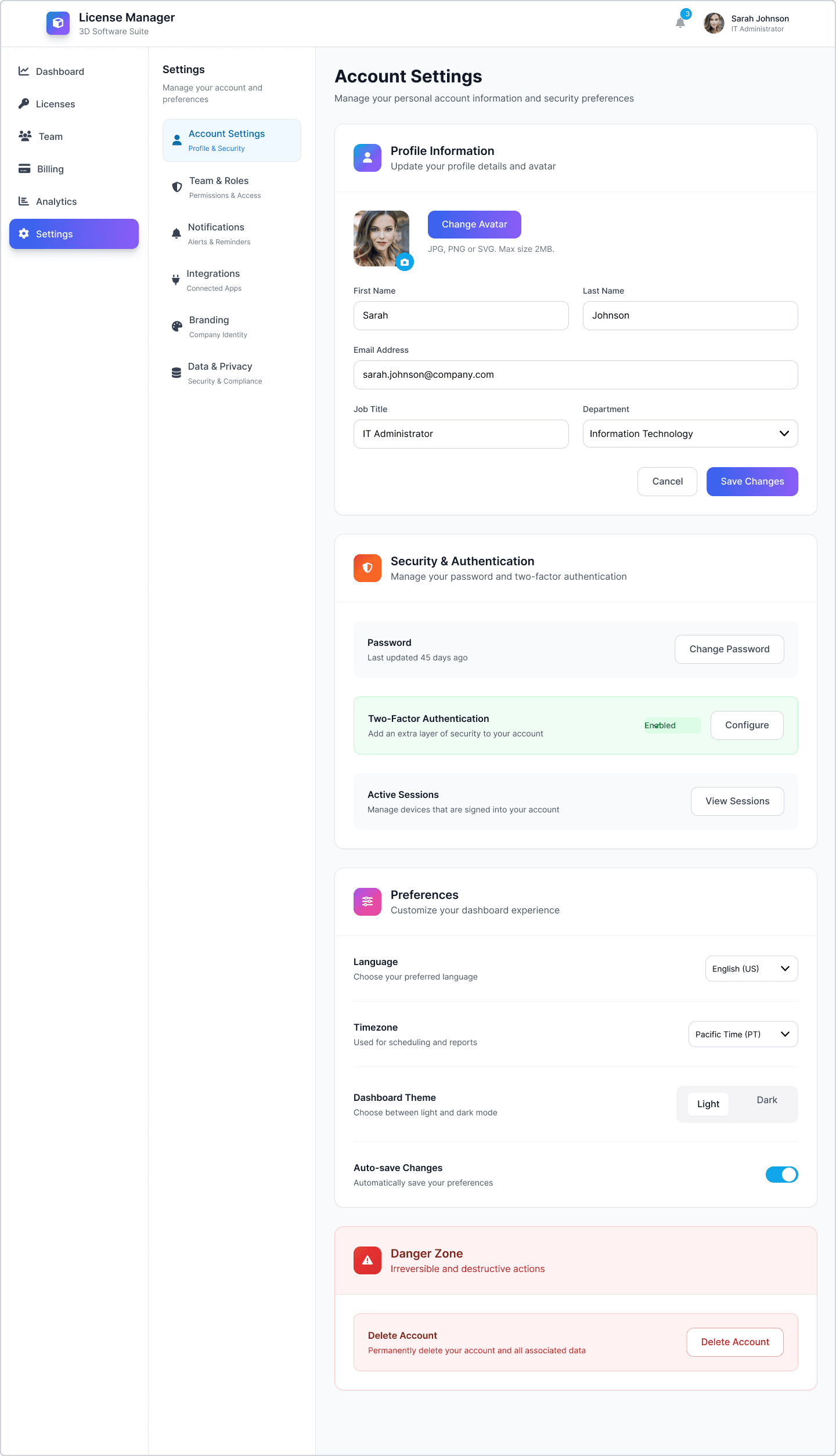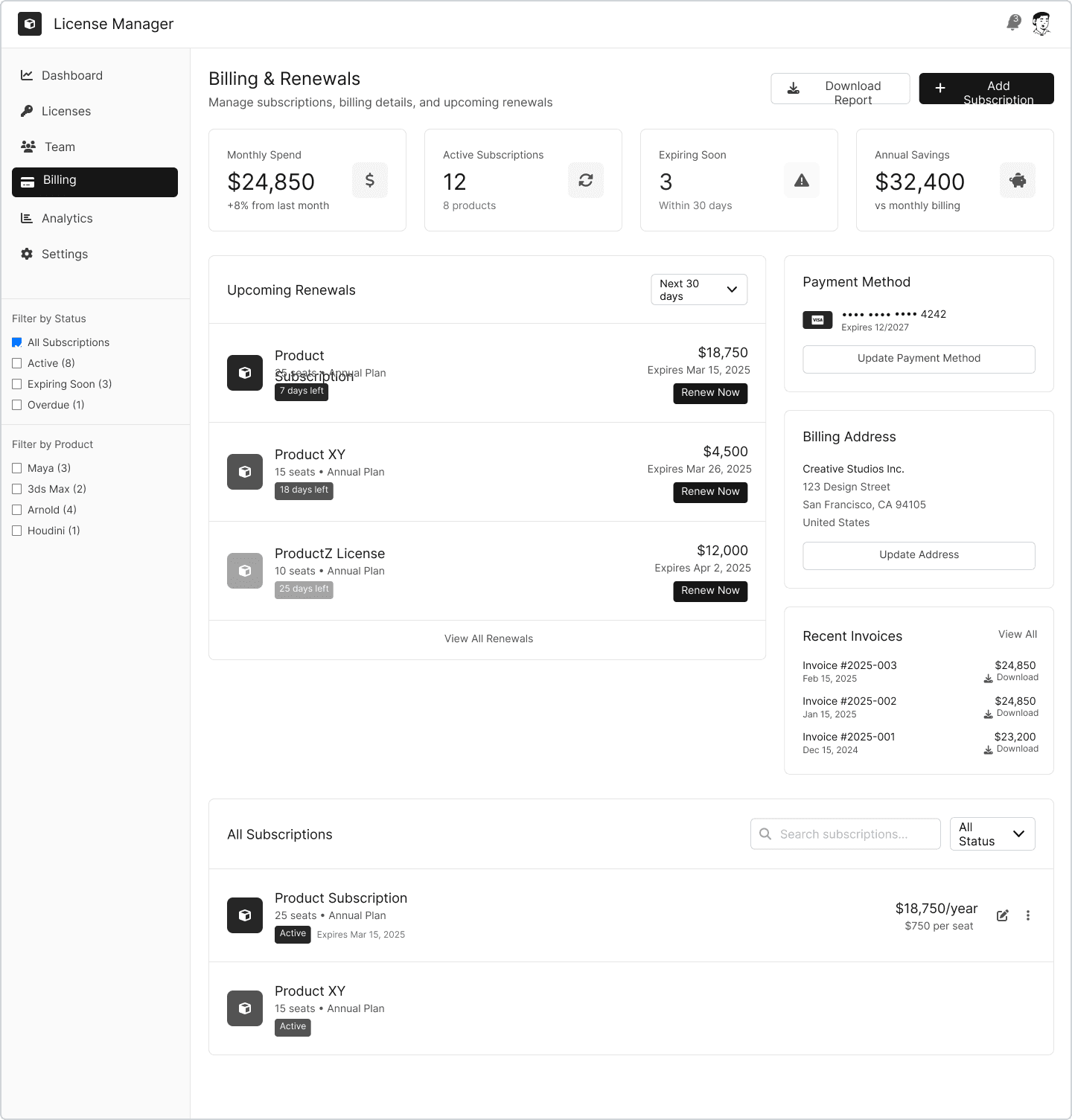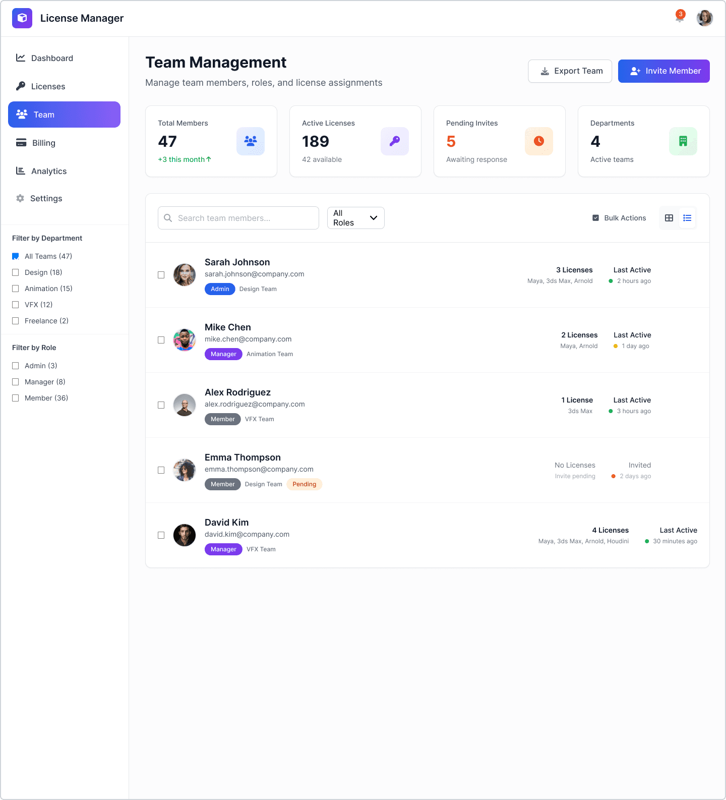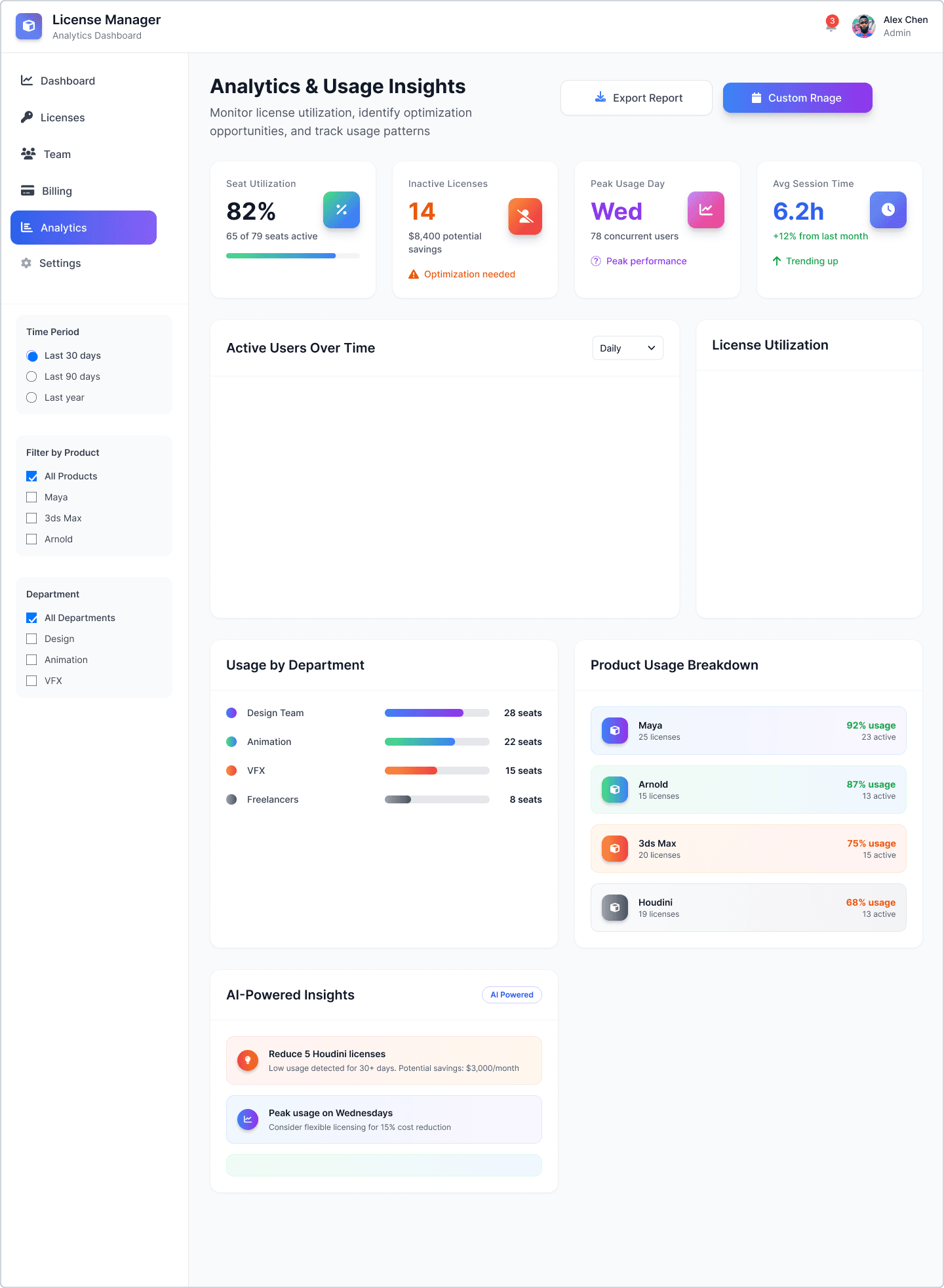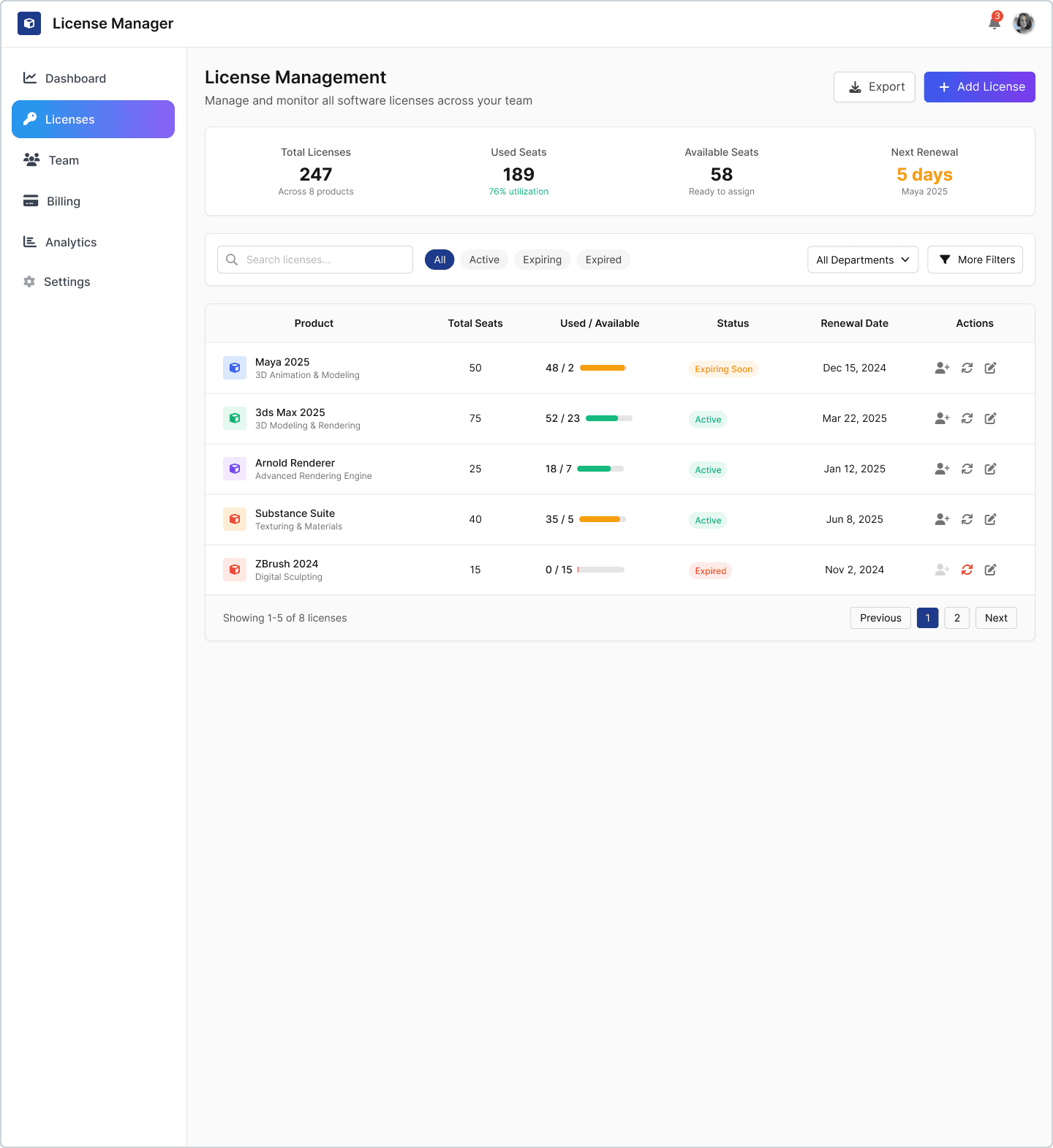 Ein modernes Lizenz-Management-Dashboard für ein 3D-Softwareunternehmen, das komplexe Team-Workflows vereinfacht – mit einem skalierbaren, klar strukturierten Designsystem für Enterprise-UX.