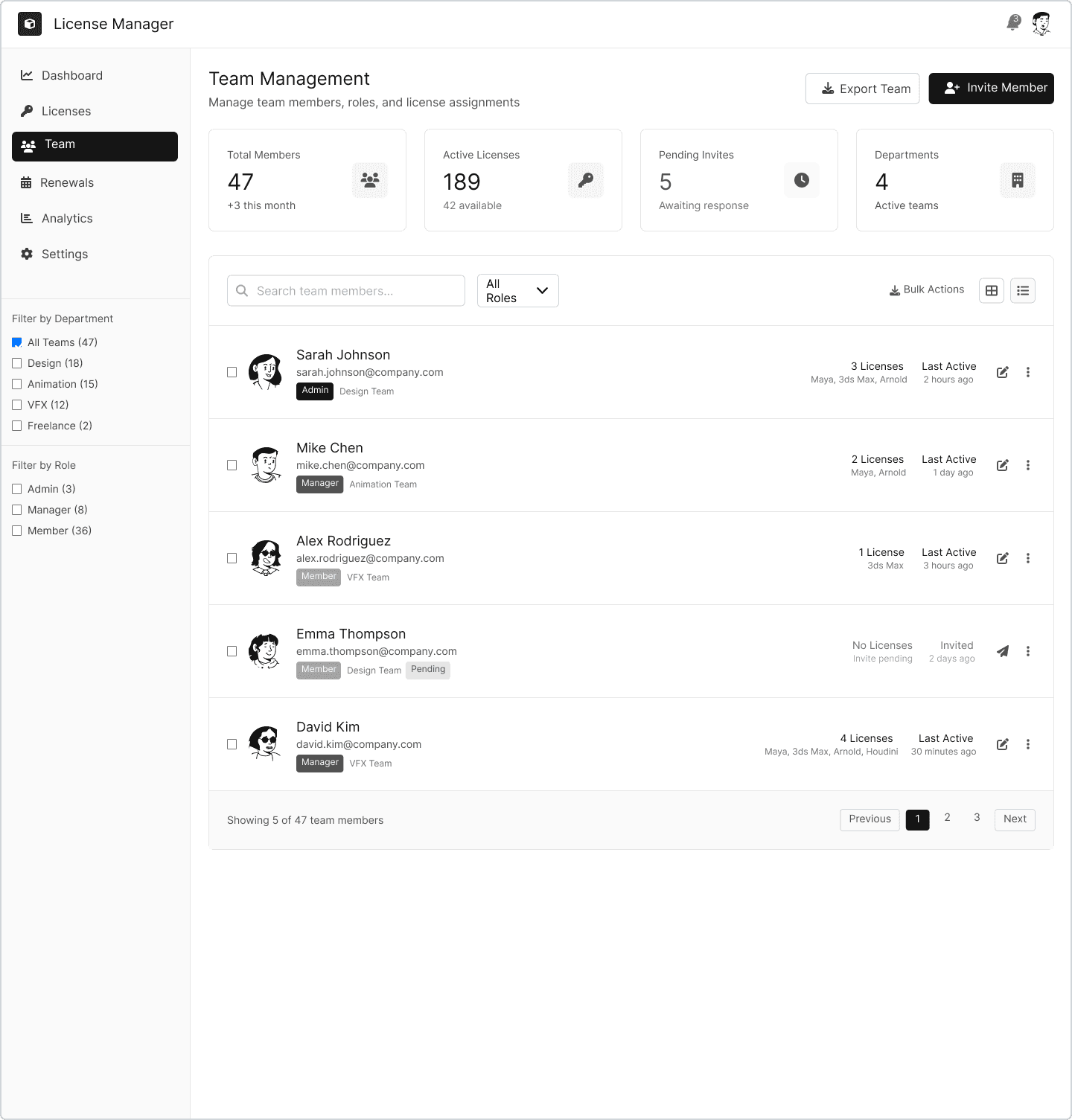 Admins sehen alle Teammitglieder inkl. Rolle, Aktivität und zugewiesenen Lizenzen.