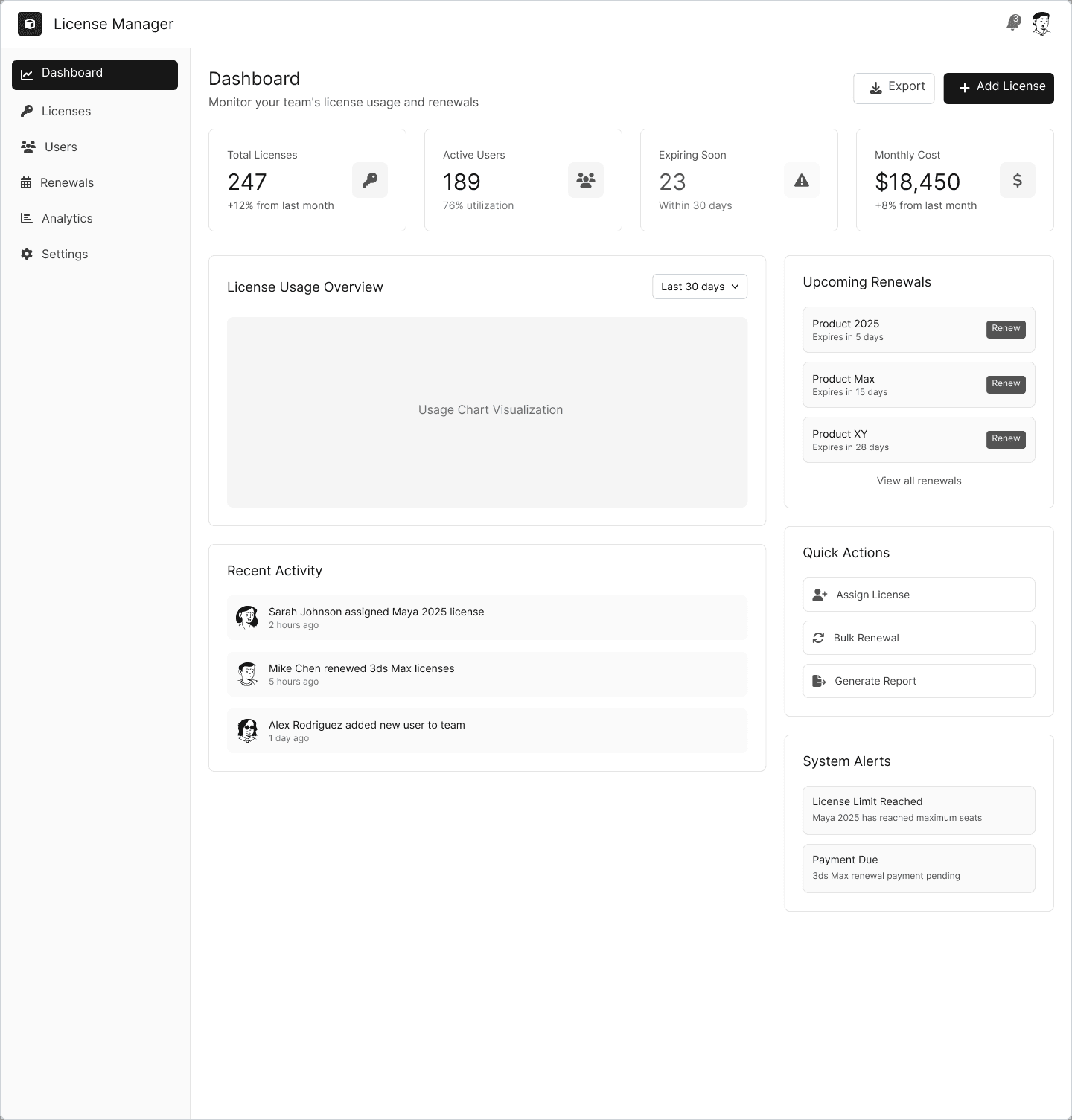 Zentrale Startseite mit allen Kernmetriken: Gesamtanzahl der Lizenzen, aktive Nutzer:innen, anstehende Verlängerungen, Warnungen.
